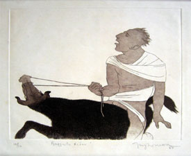 Each of the different value areas on a plate is etched at different length of time. The deeper the etch, the more ink will gather in the etched texture and the more solidly the area will print. To learn to look at the topography of an etching; the metal's subtle clues of process and of the artist's decision-making choices, offers another level to enjoy.